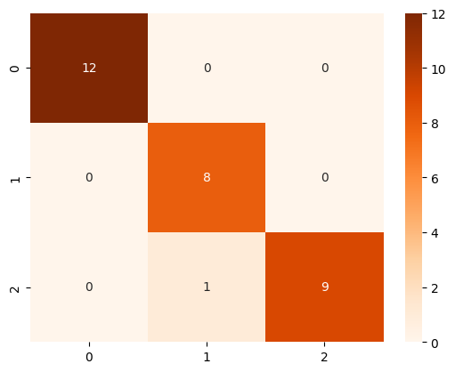 # Create a Seaborn heatmapimport seaborn as snssns.heatmap(cm, annot=True, cmap='Oranges')
